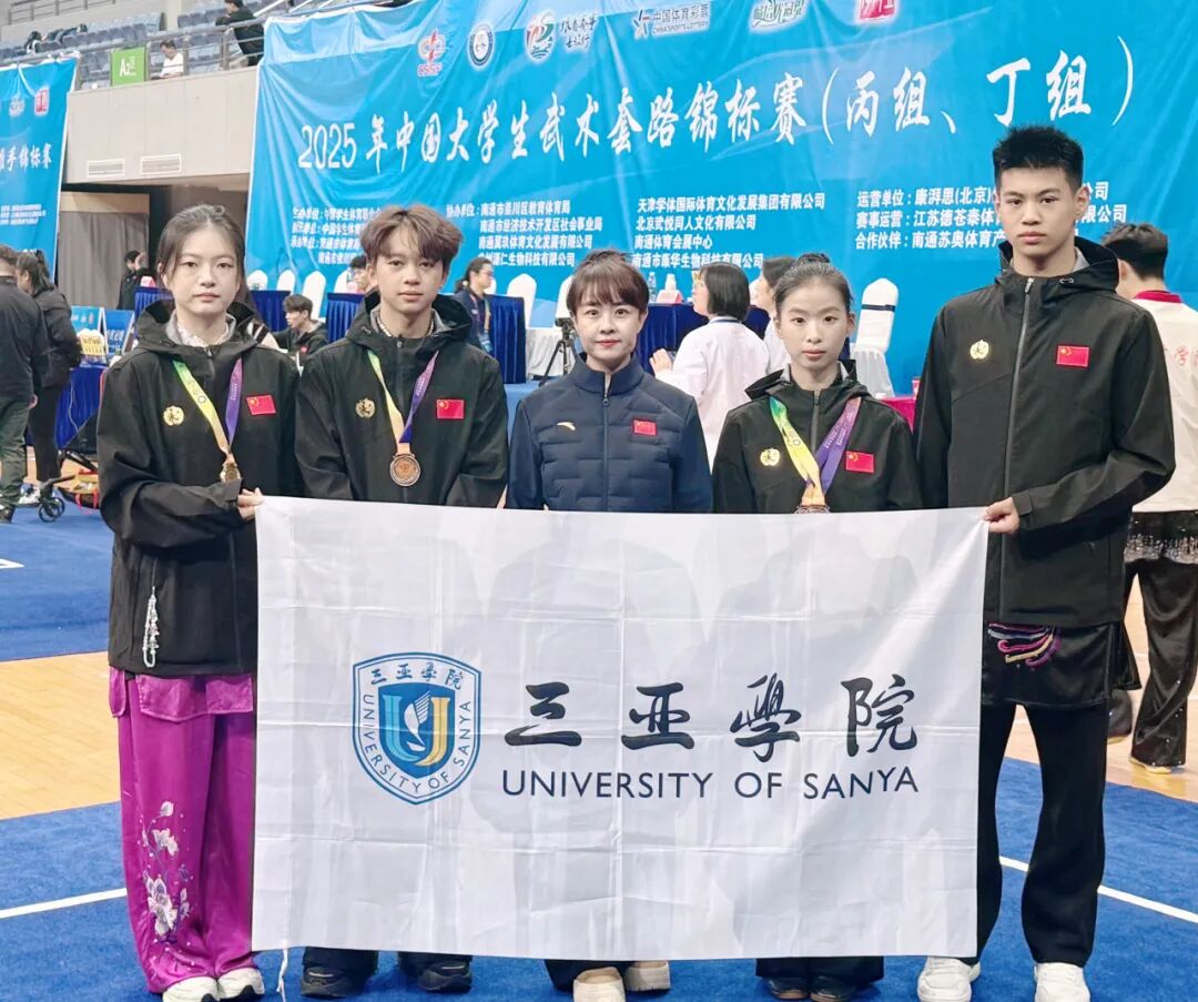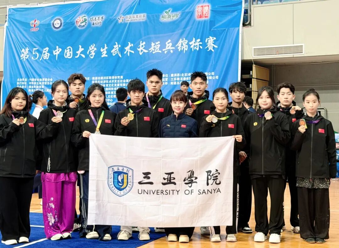5屆中國(guó)大學(xué)生武術(shù)長(zhǎng)短兵錦標(biāo)賽三亞學(xué)院代表隊(duì)在10名體育學(xué)子的頑強(qiáng)拼搏、團(tuán)結(jié)協(xié)作下獲得145銅,女子團(tuán)體總分并列第三名、男子團(tuán)體總分第八名的佳績(jī),武術(shù)2301趙磊授予優(yōu)秀運(yùn)動(dòng)員、李曉媛副教授授予優(yōu)秀教練員稱號(hào)。
